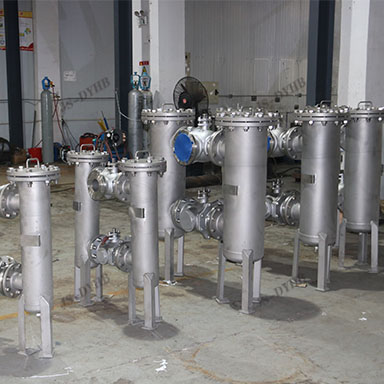 高低籃式過濾器(qì)主要由進出口的接管和法蘭、筒體、濾籃、筒(tǒng)體(tǐ)法蘭、筒體法(fǎ)蘭蓋(gài)及(jí)緊固件等組成。當液體(tǐ)通過進口進去筒體流經濾籃(lán)後, 固體雜質顆粒被阻攔在濾籃內,而潔淨的流體(tǐ)通過(guò)濾